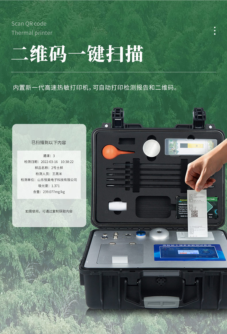 ★21、內置新一代高速熱敏打印機(無需色帶),打印內容包含:檢測單位、檢測人員、檢測項目、通道號、吸光度、養分含量(mg/kg)、檢測時間、以及二維碼等信息