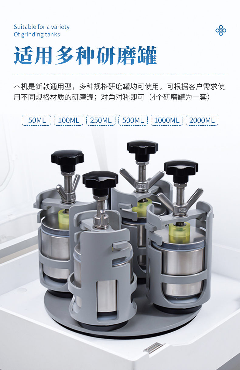 1. 適用研磨罐:本機是新款通用型,50ml規(guī)格研磨罐,可根據(jù)客戶需求使用不同材質(zhì)的研磨罐;對角對稱即可(4個研磨罐為一套)。